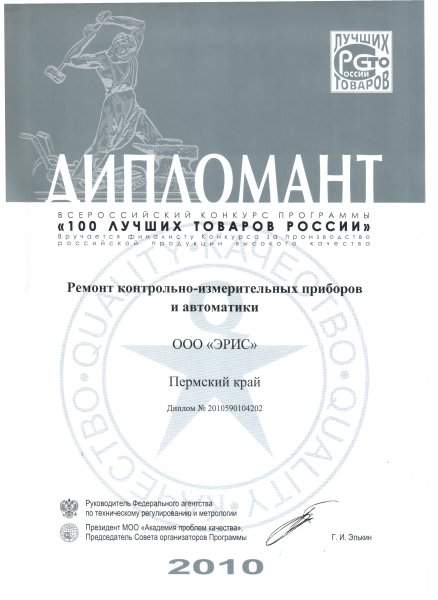 Группа компаний «Эрис» стала дипломантом конкурса «100 Лучших товаров России 2010» в номинации «Услуги промышленности» и «Продукция промышленного назначения».